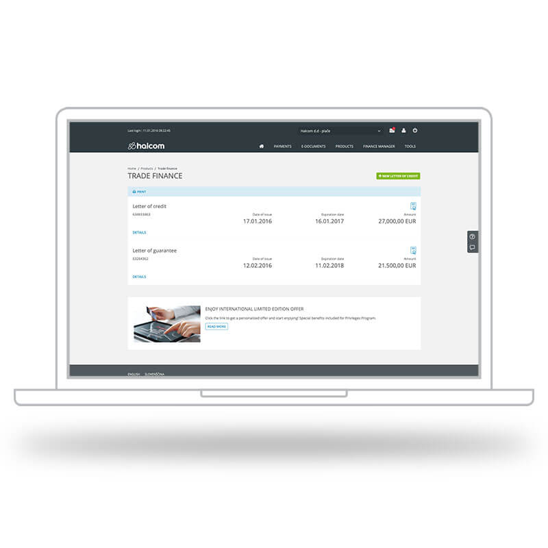 Omogočene so funkcionalnosti upravljanja trgovinskega financiranja, kot so prošnja za akreditiv, definicija obvestila o plačilu, popravek zapadlih akreditivov, preklic akreditivov in pregled akreditivov.